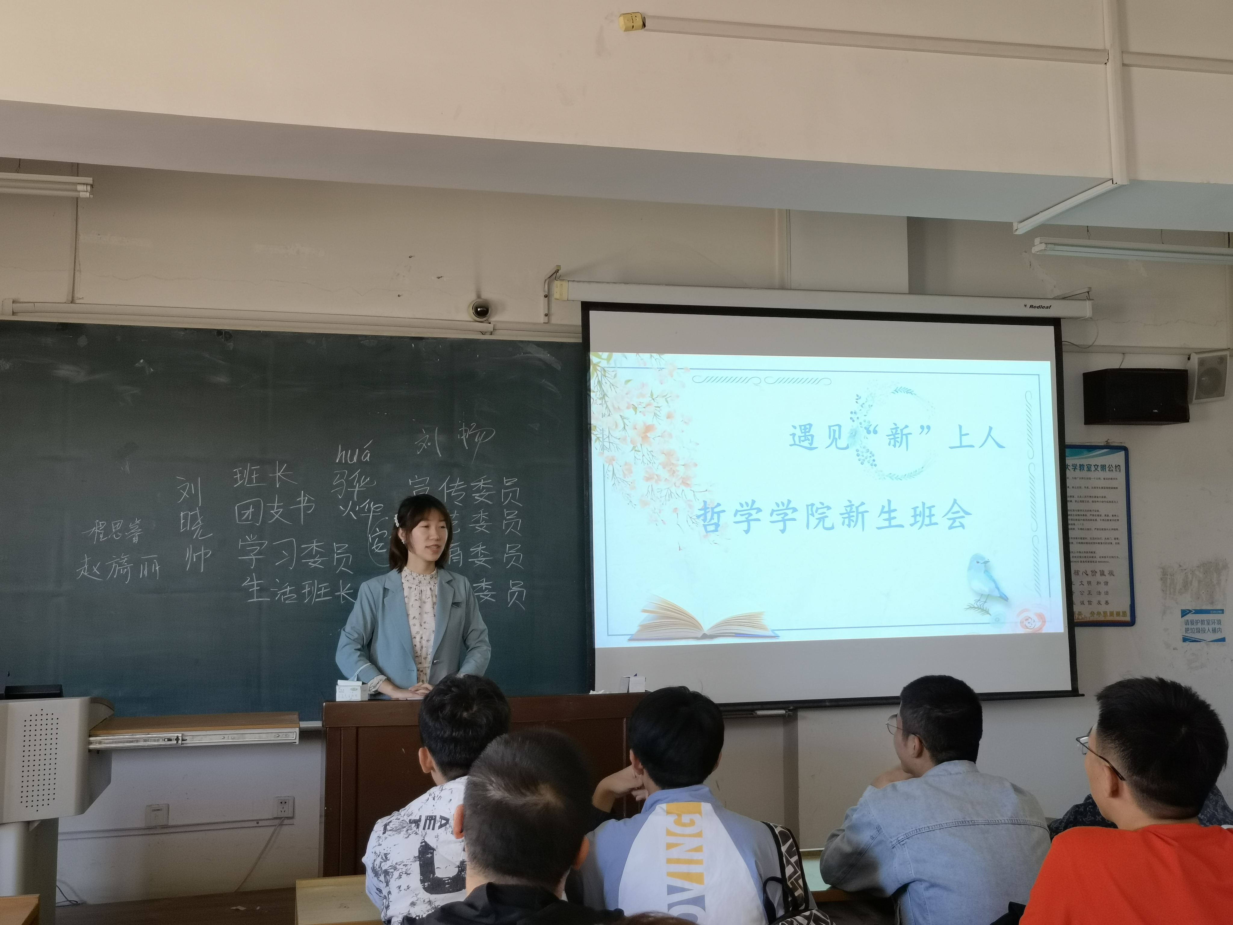 接下来,焦老师进行了自我介绍。这位充满活力的辅导员老师表示,在未来的四年中,将与同学们共同走过大学生活,她将同大家一起成长。她强调了班干部的责任与担当,并明确了大学生活与学习的日常要求。同学们明白了作为班级干部责任与担当,更加慎重地考虑自己的选择。