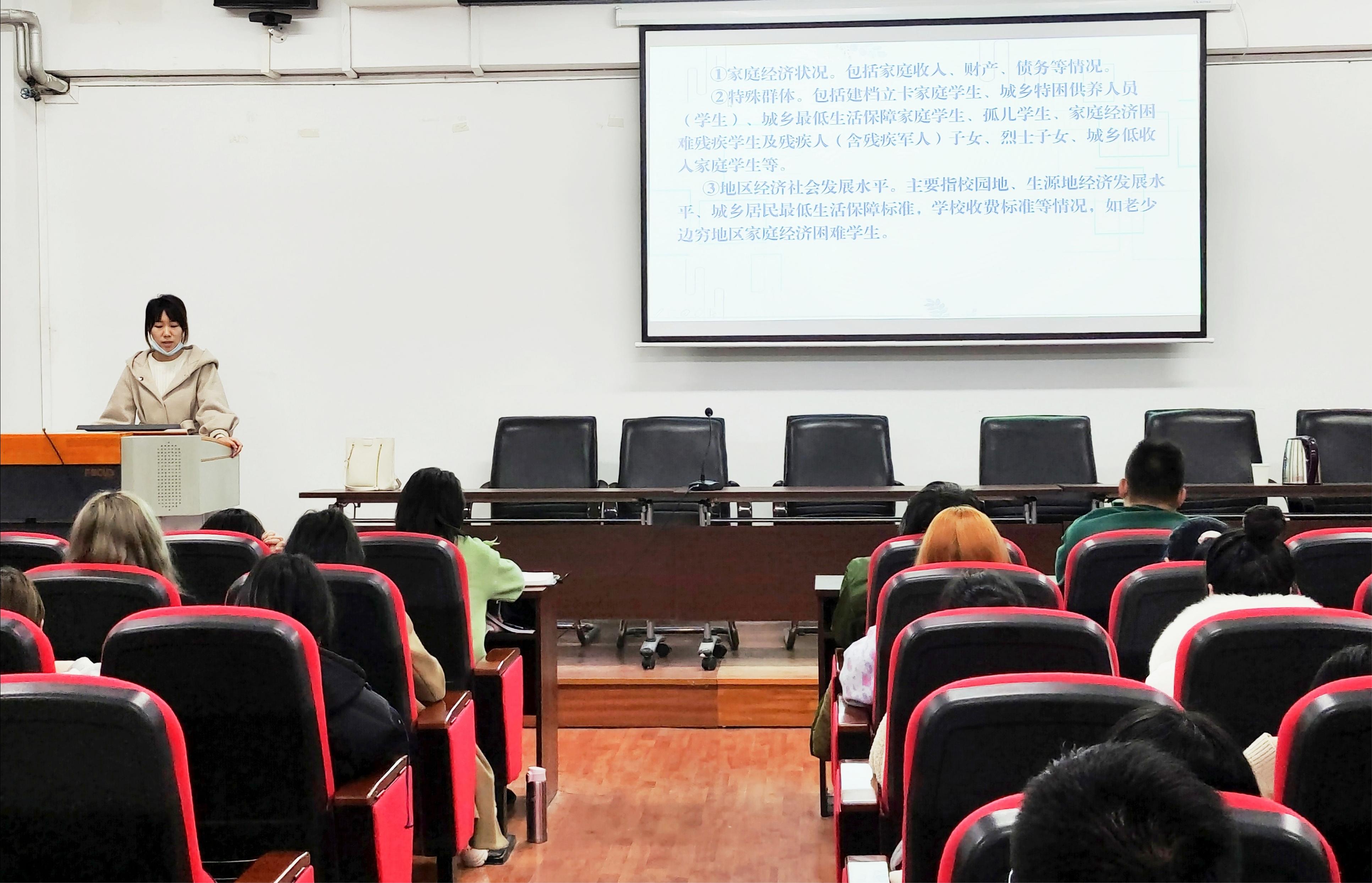 家庭经济困难学生认定工作实施办法》,对申请方式、认定范围、困难类型、认定依据、评定流程逐一进行了细致的解读,焦老师说明了8种家庭经济困难学生类型、3种困难程度以及不能认定为家庭经济困难学生的情况。其次,焦老师说明了家庭经济困难学生认定需要准备的相关证明材料,以保证学生明晰准备哪些材料。最后,焦老师强调家庭经济困难认定涉及困难学生的切身利益,全体同学都应知晓,并且对认定学生会进行家访考察,必须公平公正、诚信守纪,申请认定同学需根据个人情况如实汇报并申请,不申请同学必须做好监督、公平评议工作,将贫困认定给真正需要帮助的学生,不让任何一个学生因贫困而耽误学业。