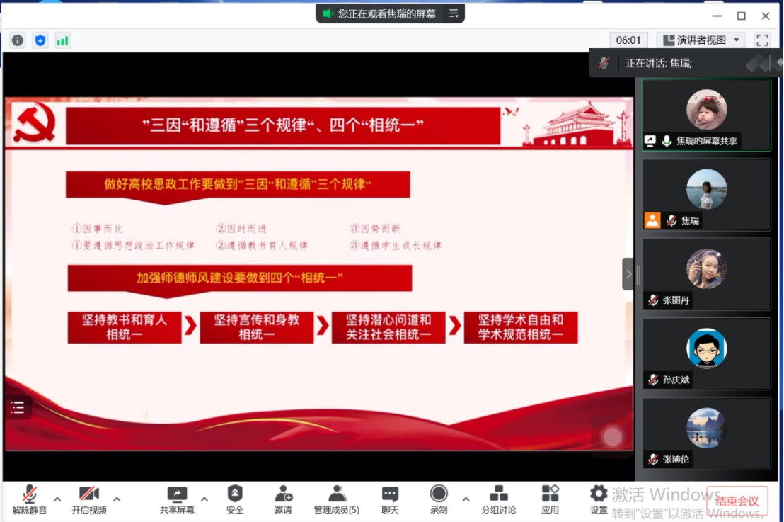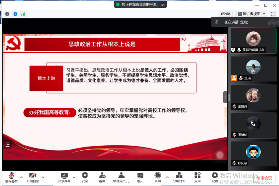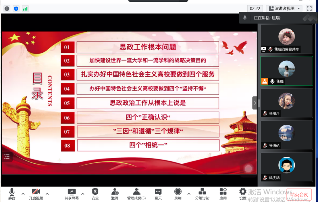 党总支副书记张丽丹老师主持,19级辅导员孙庆斌老师、18级20级辅导员张博伦老师、21级辅导员焦瑞老师参加会议。