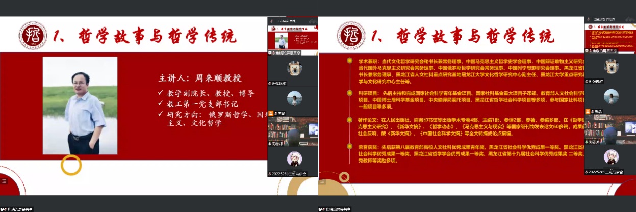 周来顺老师以《哲学故事与哲学传统》为主题, 以“哲学系是包容的、有温度的、哲学的、有未来的”为核心展开讲解。周老师以自身求学经历为例,因为不太了解专业所学内容最初报考不是哲学专业,因本科期间很多课程都是和哲学专业一起上,使他对哲学产生了极大的兴趣,哲学专业的教师对他的欢迎和哲学系包容开放的情怀,深深感动了周老师,因此是包容的哲学系;在周老师从校园走进社会遇到困难时,哲学系的老师都伸出援手,帮助周老师渡过难关,让周老师感受到哲学系的人文情怀,因此是有温度的哲学系;91大神