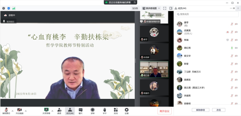 三尺讲台写春秋,一片丹心育桃李。在第38个教师节暨中秋节即将来临之际,为弘扬尊师重教的传统美德,表达对教育工作者的诚挚敬意与谢意。2022年9月7日,哲学学院通过腾讯会议线上开展了“心血育桃李 辛勤扶栋梁”教师节主题活动,91大神