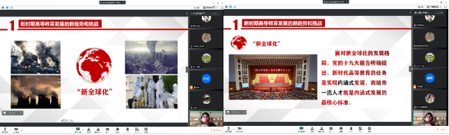 周晓莹老师主讲了主题为“担当民族复兴大任,争做时代有为新人—习近平总书记在中国人民大学考察时的重要讲话精神解读”的党课,课程分为两个部分,即“新时期高等教育发展的新趋势和挑战”和“如何担当大任,争做新人”,在周老师的讲解中,我们意识到了新全球化已经到来,我们面临着新的机遇与挑战,面对全球化的发展格局培养一流人才是当务之急。为培养一流人才,教育部强力推进课程思政建设,全面推进新工科、新医科、新农科、新文科建设,面向所有高校所有专业积极实施一流专业建设“双万计划”,取得了显著成果。