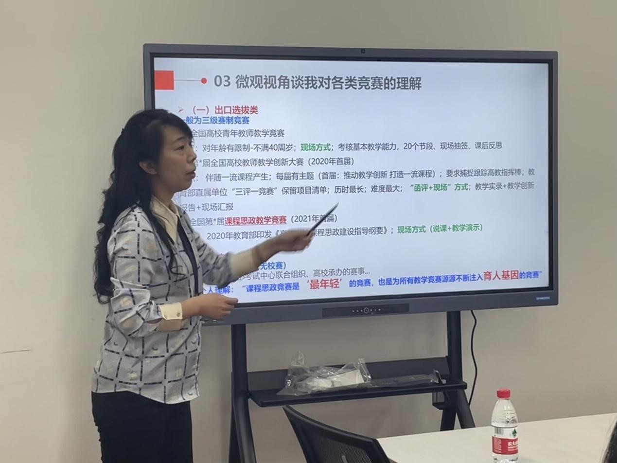 的课程思政建设提供了宝贵的经验。自由交流环节,老师们踊跃发言,结合自己的实际,向王老师取经,本次活动既增强了我院教师教学过程中不断改进教学方法和完善教学方案的主动性,又激发了教师关注课程思政、参加各类相关竞赛活动的热情。