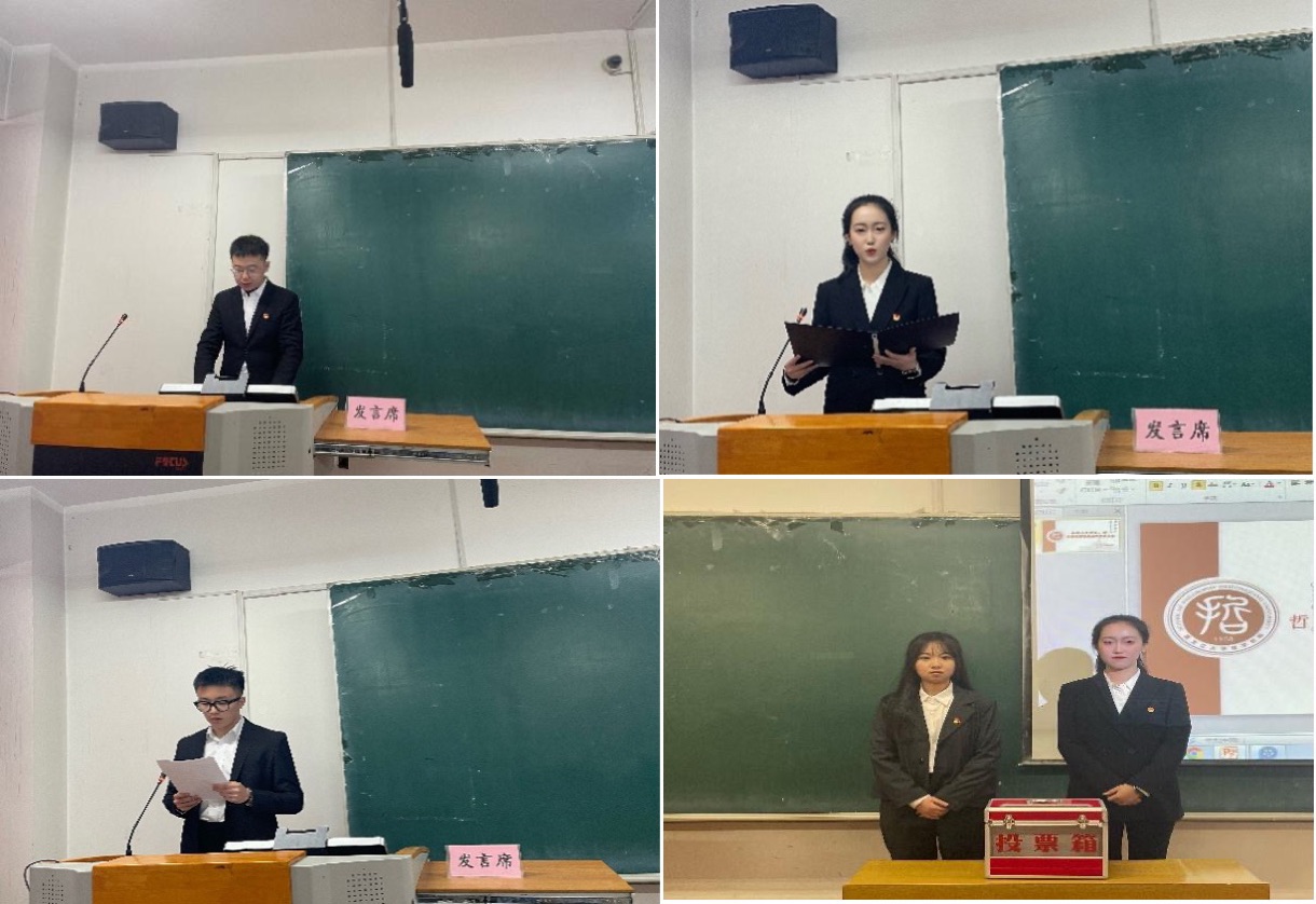 团委副书记及2021级、2022级辅导员焦瑞老师宣布投票结果:陈秋凡同学担任学生会主席,唐苓、李金埔同学担任学生会副主席,新一届学生会主席陈秋凡上台致辞演讲。