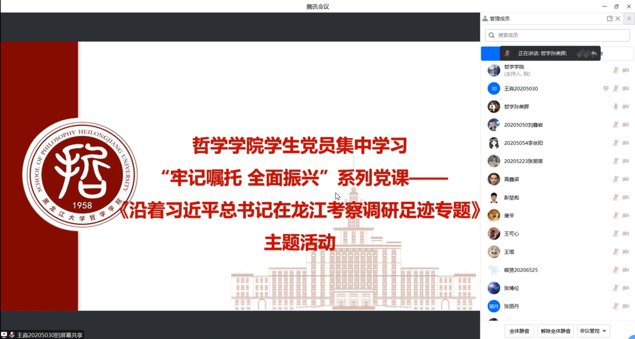 为深入贯彻习近平总书记对东北地区和我省重要讲话重要指示精神,推动学习贯彻习近平新时代中国特色社会主义思想主题教育走深走实。2023年7月31日—8月5日,哲学学院根据学校党委组织部的工作要求,积极动员并着力搭建学习平台,组织学生党员及入党积极分子集中学习、教师党员结合个人情况自行学习省委主题教育领导小组办公室制作的《“牢记嘱托 全面振兴”系列党课——沿着习近平总书记在龙江考察调研足迹专题》(第1-6期)。