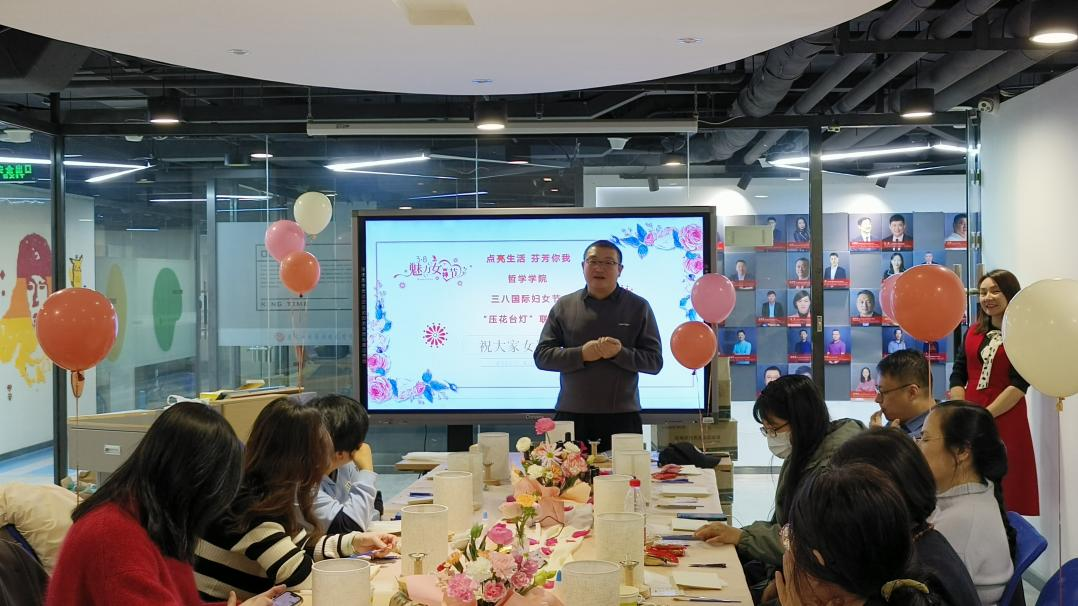 于3月6日为全体女教职工举办了既暖心又有趣的“压花台灯”联欢活动。哲学学院党总支书记孙美晖、副书记王贵宇、学院工会代表以及女教职工参加了此次活动。