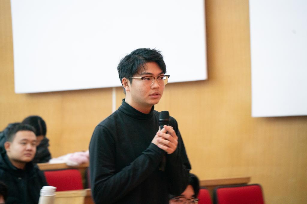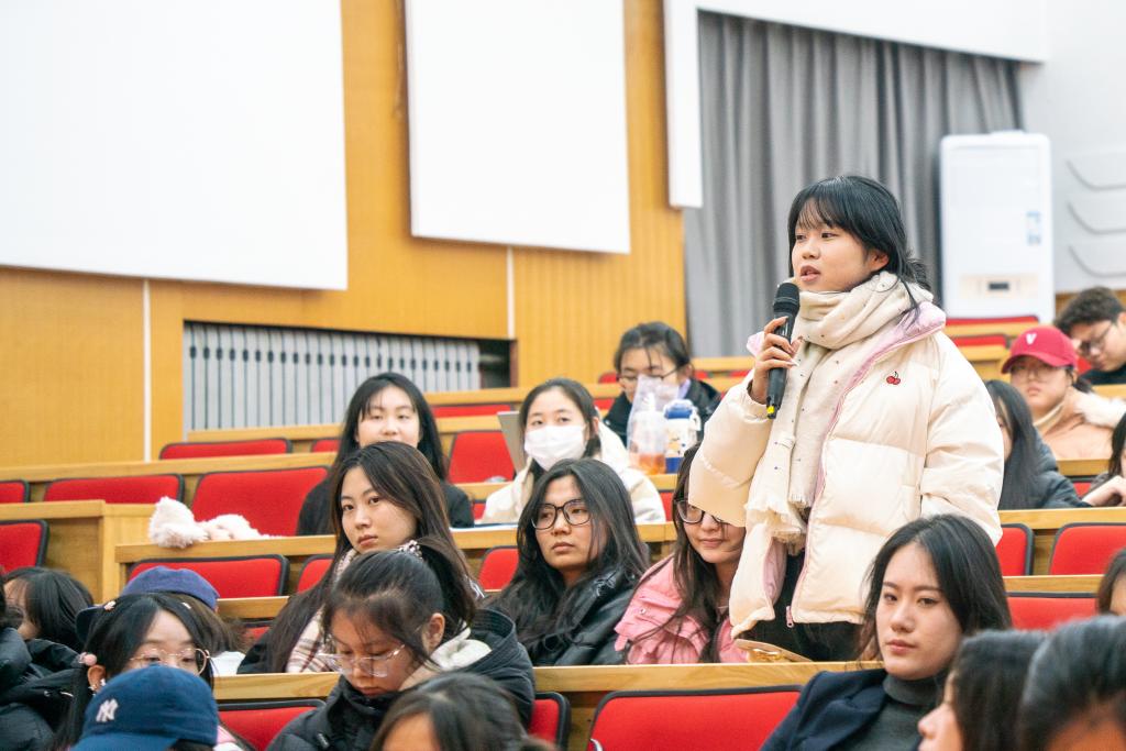 领略劳模风采,照亮求学道路。访谈结束后,同学们受益匪浅,纷纷举手想与魏老师进行互动,在互动提问环节中,同学们提出了“如何做到吃苦而不觉得苦”、“自己想做劳模但担心别人说自己卷”等问题。魏老师分享到,做学问“苦”,但是看到学生们脸上露出的笑容、看到自己又在学术上上了一个台阶,苦中就真的有“乐”了。魏老师叮嘱同学们,当听到左右自己想法的声音时,首先要有坚定自己的志向与选择,以真才实学服务社会;第二要保持热爱,追寻心中所爱,修科学之真,修人文之善;第三要潜心学问,静心笃志,无畏失败。