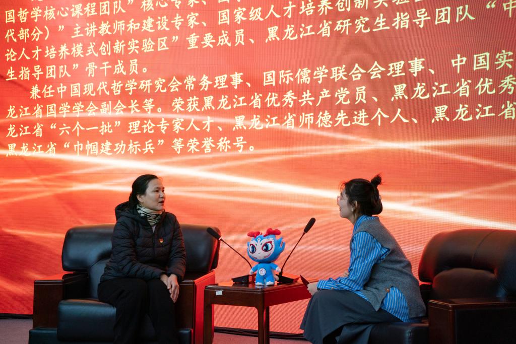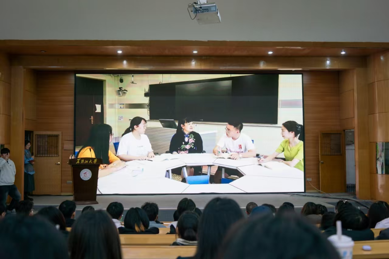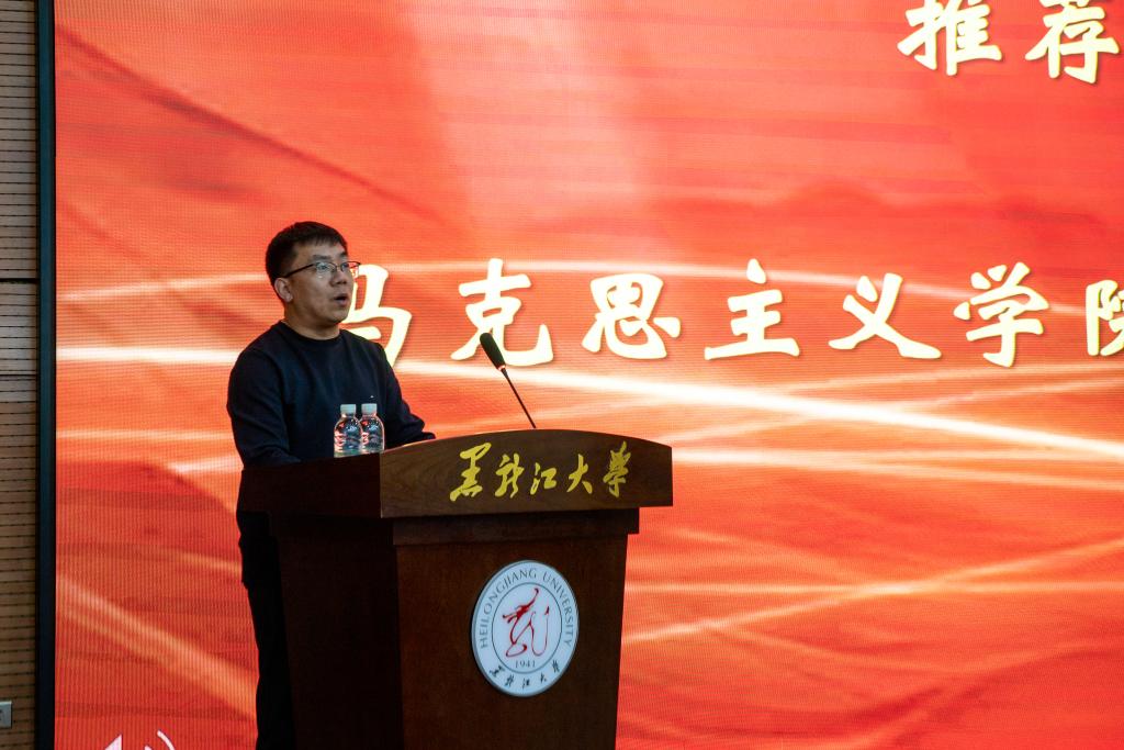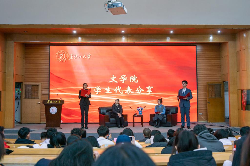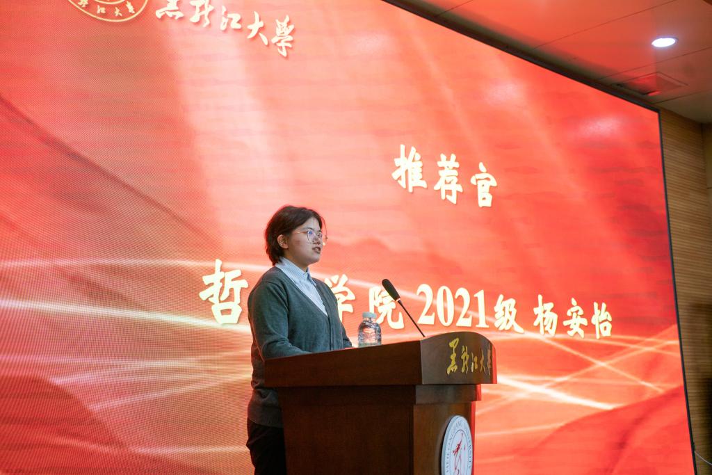 榜样在身边,劳模我推荐。在魏义霞老师上台之前,全场师生共同观看了“走进黑龙江省劳动模范——魏义霞”宣传视频,大家深深地被魏老师的学术魅力和人格魅力所吸引。马克思主义学院教师李洪杨、哲学学院2021级本科生杨安怡作为推荐官向大家介绍了他们眼中的魏老师。李老师分享了魏老师对他的教诲与启迪,正是在魏老师的影响下,他才走上了中国哲学的求学之路。杨安怡同学向我们分享了魏老师教书育人中所展现的“三牛"精神,魏老师在颈椎病导致右手无法抬起的情况下仍然坚持上课,她不仅关心学生的学业,还始终关注他们的心理健康和成长,以全方位的关爱引导每一位学生成长成才。通过他们与魏老师相处经历的分享,我们看到了一位“潜心科研、创新进取”的学者、“勤勉教学、作育英才”师者,以及 “忘我工作、无私奉献”的劳动者。