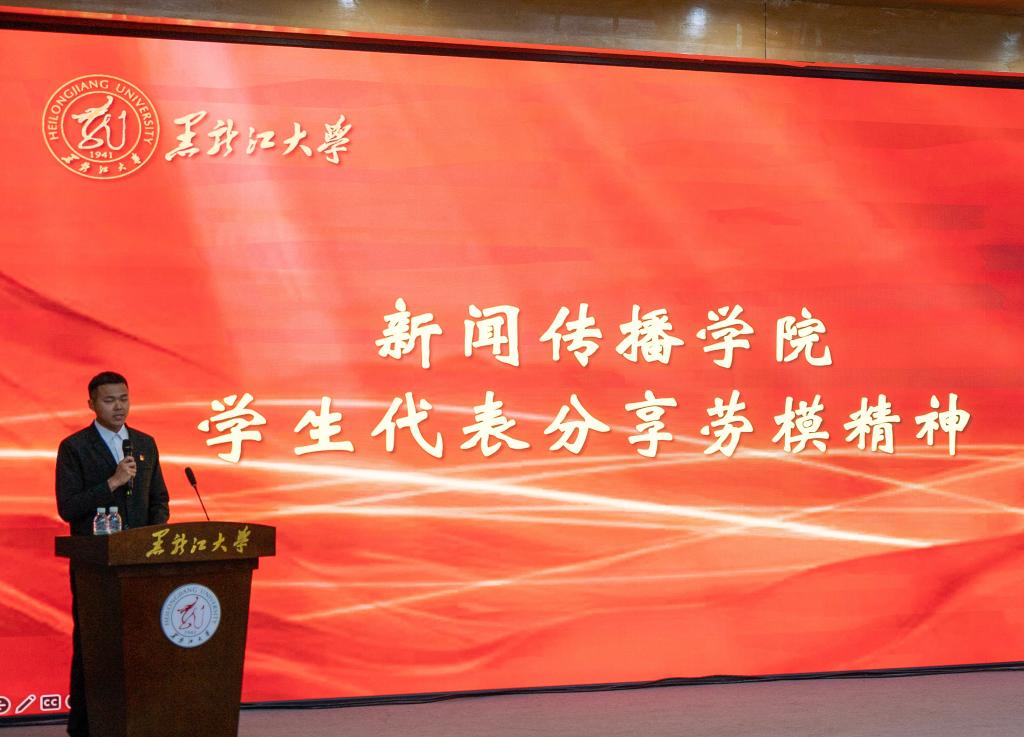 扎根基层,致敬模范。在活动伊始,2022级新闻传播学院的原文龙同学分享了老梁新闻评论班的研学经历,他们走访了位于齐齐哈尔市富拉尔基区的中国一重、大庆油田,近距离的感受了劳模精神、劳动精神和工匠精神,通过原同学的分享,同学们了解到了广大劳动群众在一线的坚守与付出。