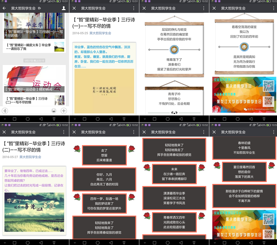 诗篇虽短,情意绵长,常怀梦想,青春不散!在本次三行诗征集活动中,来自各个年级的同学们用简单却真诚的诗句表达了对毕业生同学的祝福和对母校的深深眷恋。我们相信,在2016年的毕业季里,青春、梦想、温情与感动将共同谱写出最优美的乐章,它将伴随着优秀的黑大学子昂首阔步走出校园,迈向更加绚丽的舞台,书写更加辉煌的未来!