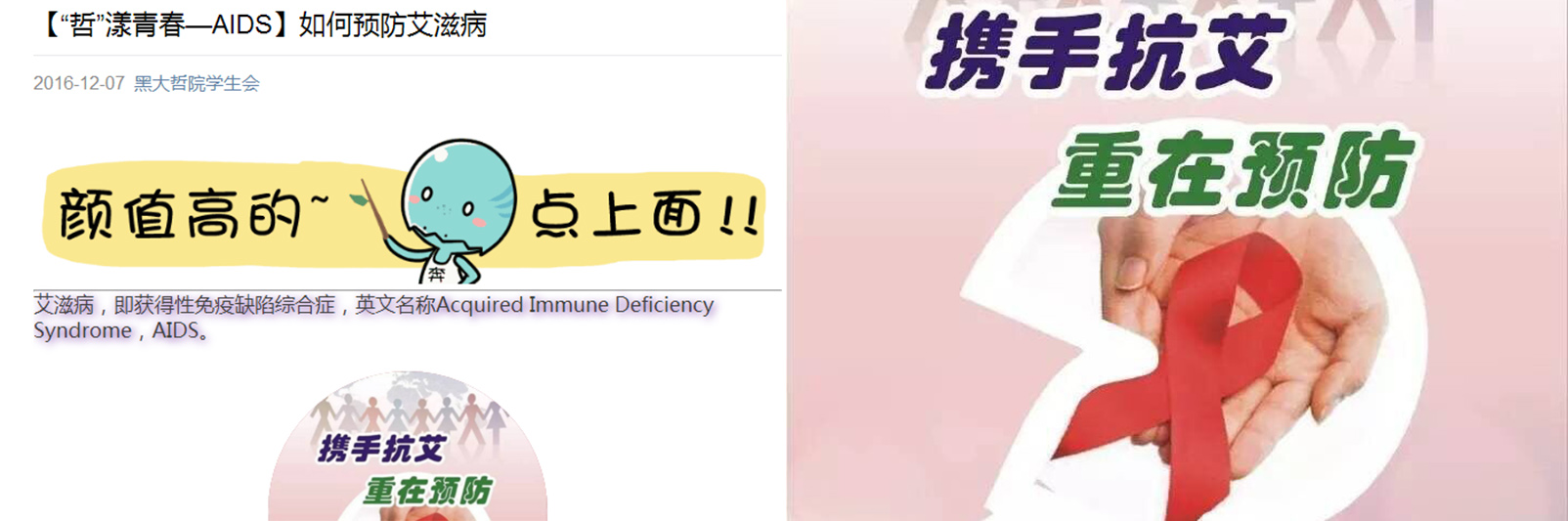 学生会在微信、微博等官方公众平台上进行了内容推送,对艾滋病的相关知识进行了宣传。在这期间,同学们了解到每天有超过7000人新发感染艾滋病,全世界各地区均有流行。专家估计,艾滋病全球流行重灾区可能会从非洲移向亚洲。据中国疾病预防控制中心估计,我国存活HIV携带者及艾滋病患者约78万人,全年新发感染者4.8万人,死亡2.8万人。主要传播途径有血液传播、性传播和母婴传播等,这些内容推送使同学们对艾滋病有了进一步的了解。与此同时,91大神
