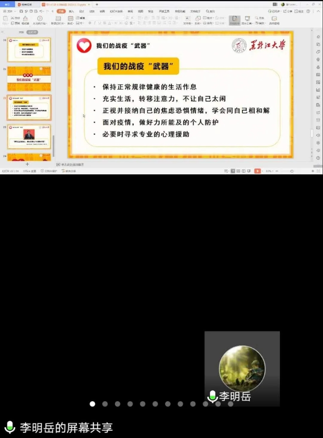 郝星宇和刘思楀分享了疫情防控特殊时期参加线上课程的学习经验和方法,指出线上学习要严格按照任课老师的安排,认真对待每一堂课,积极参与到课堂活动当中,自觉安排学习任务,做好规划,合理作息,关注学习进度,保障健康和学习两不误,在战“疫”中发挥自身作用,贡献出自身应有之力。张博伦老师介绍了在疫情防控期间,学院利用新媒体平台开展线上思想政治教育和文化活动的情况,赵岚淇和历芷玉同学分享了自身积极参与线上活动的心得和体会,表达了学生党员积极响应“少出门,不聚集”号召,合理调节生活节奏,增进与家长沟通交流,居家防疫为防控贡献力量的表率带头作用。李明岳和王天夫同学介绍了居家学习生活期间的心理调节知识方法和有效经验,展现了学生党员积极向上,乐观阳光,坚定战胜疫情信心,以实际行动传递正能量的先锋模范发挥。