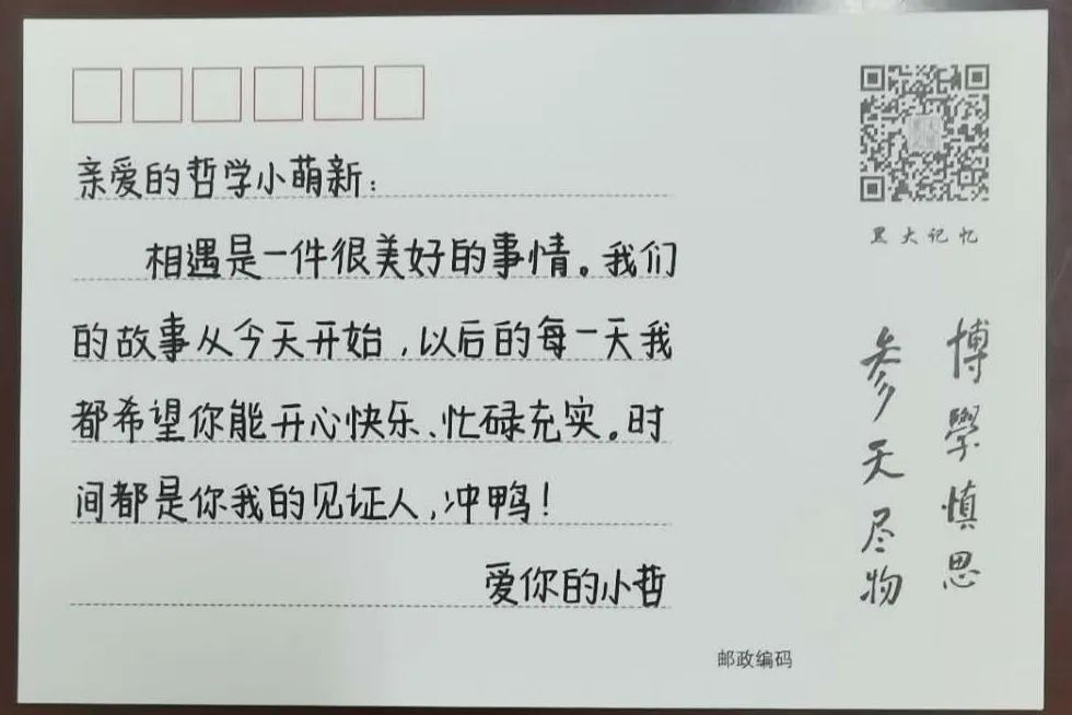 高年级学长学姐为2020级学弟学妹手写“暖心”明信片。明信片为黑大主题定制明信片,正面为黑大主要标志性建筑及景物,背面为学院在校年级学生撰写的祝福与寄语,有助于帮助 2020级新生进一步了解校史校情,熟悉校园环境,提升2020级新生爱校荣校观念。