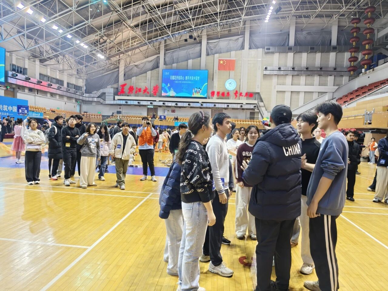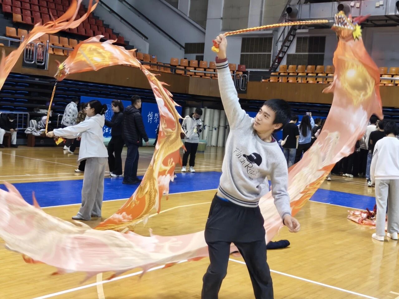 的同学化身“舞龙手”,高擎龙首、摆动龙身,在空中划出灵动弧线,让大家见证到这项传统项目的魅力。同心鼓项目区,同学们围站成圈,攥紧鼓绳紧盯排球,在这一起一落的节奏里,不只是在完成项目,更像把“同心协作”的传统意涵,变成了同学们亲手践行的鲜活体验。