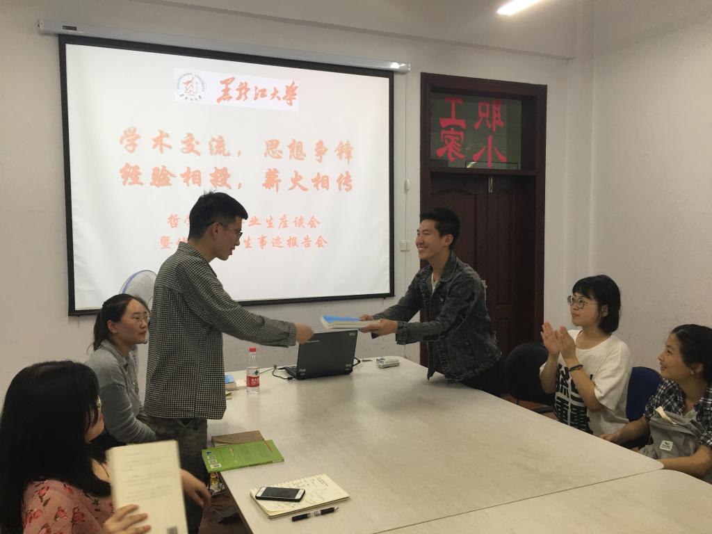随后,报告会的主讲者陈洋、都新豪、张宸晟、袁传志等四名2018届优秀毕业生代表,分别与在座的学弟学妹分享了大学四年成长成才的心路历程。陈洋同学分享了她的学习和保研准备相关经验,重点向大家介绍了如何准备保研的笔试面试,为大家讲解了一些实用技巧;都新豪同学主要为大家分享了外国哲学的一些学习经验,以及如何获取考研信息和选择考研院校的前期准备;张宸晟同学为同学们讲解了专业基础课程的学习方法,以及如何高效复习备考的方式方法;袁传志同学结合自身学生干部经历,主要分享了如何协调处理好学生工作和其他事情与学习之间的关系问题。四位优秀毕业生在校期间学习成绩优异,各方面表现突出。四位同学均结合自身实际向大家分享了各自的经验,从中传递出的共同品质是持之以恒、不懈奋斗、心中有梦想、懂得感恩回报,正是这些可贵的品质让他们变得如此优秀。报告完毕后,毕业生代表们和同学们进行了交流互动,对同学们的一些疑问进行了耐心细致的解答。最后,四名优秀毕业生代表向低年级学弟学妹赠送了相关专业书籍,勉励学弟学妹努力学习专业知识,培养专业素养,将91大神