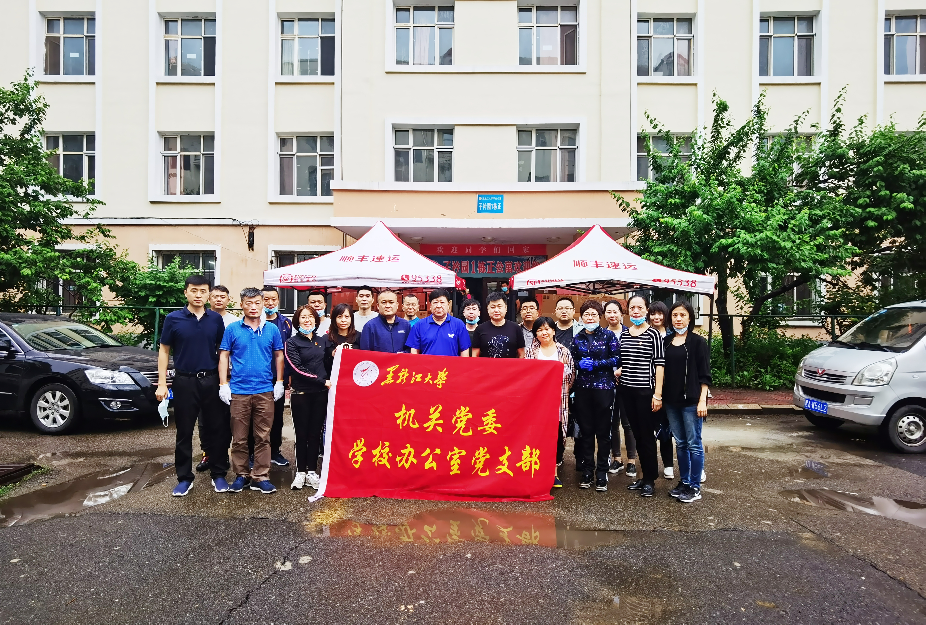 教工志愿者与校党委王永清书记及所在党校办党支部14位党员同志来到B区1栋正、B区2栋研究生寝室,帮助毕业生打包行李。