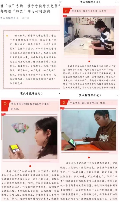 坚持以“四史”理论学习为主线,注重学习教育方式方法创新,引导学生树立正确学习观,高标准高质量完成理论学习,保障学习效果,开展“四史”学习答题专栏、哲学学子“四史”学习心得展示、学生党员“四史”知识微领学等主题活动,促进学生准确把握党的历史发展的主题主线、主流本质,做到联系实际学、突出特色学、务求实效学,以好的学风开展落实“四史”学习教育工作和主题系列活动。