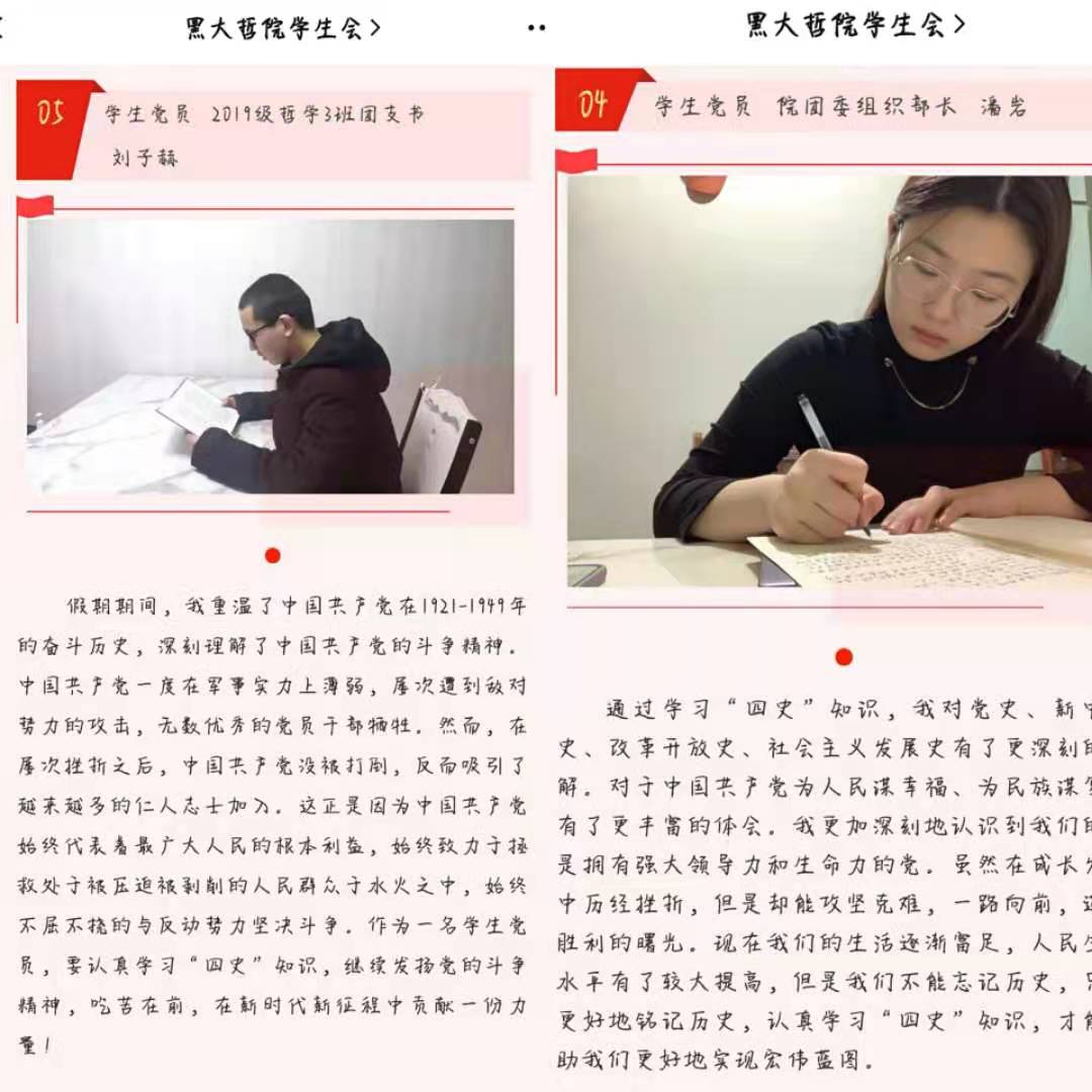 积极教育引导学生坚定理想信念,传承红色基因,认识历史规律,感悟光辉成就,积极开展“四史”人物志、“四史”歌曲我推荐、“四史”书籍介绍等主题活动,学生切实参与,查找资料撰写文案,进一步感悟思想伟力,增强用党的创新理论武装头脑的政治自觉,从党的非凡历程中感悟马克思主义的真理力量和实践力量。