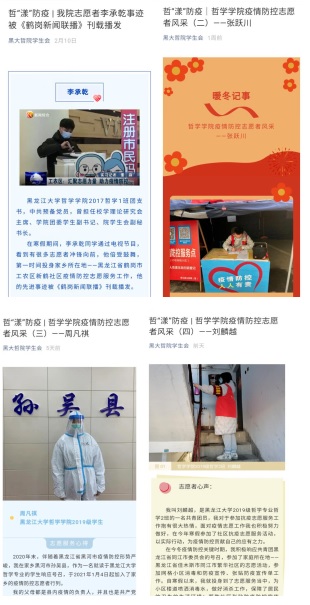 疫情防控志愿者风采专栏,促进学生以科学理论武装头脑,真正将学习与实践有机结合起来。注重报道宣传在“四史”学习教育积极影响下,学院学生主动投身疫情防控一线的先进事迹,讲好身边的“四史”学习故事,鼓励向身边典型学习,以实际行动擦亮青春底色。