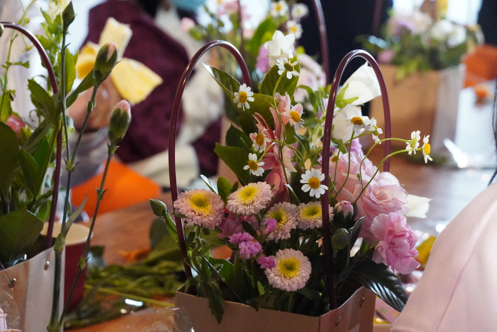 随后,经验丰富的花艺师从鲜花的寓意、色彩搭配等方面详细地给大家讲授了插花知识,介绍了插花的艺术造型要素和技巧手法,并在现场做了生动的演示。活动现场花香四溢,充满着春天的气息。职工们兴趣盎然,充分发挥自己的想象力和创作力。一支支白风铃、小雏菊、玫瑰、薰衣草等经过大家的修剪、搭配,变成了一篮篮错落有致、色彩鲜艳、造型各异的插花作品,寄托着大家对美的理解和对幸福的感悟。在一片欢声笑语声中,活动落下了帷幕。