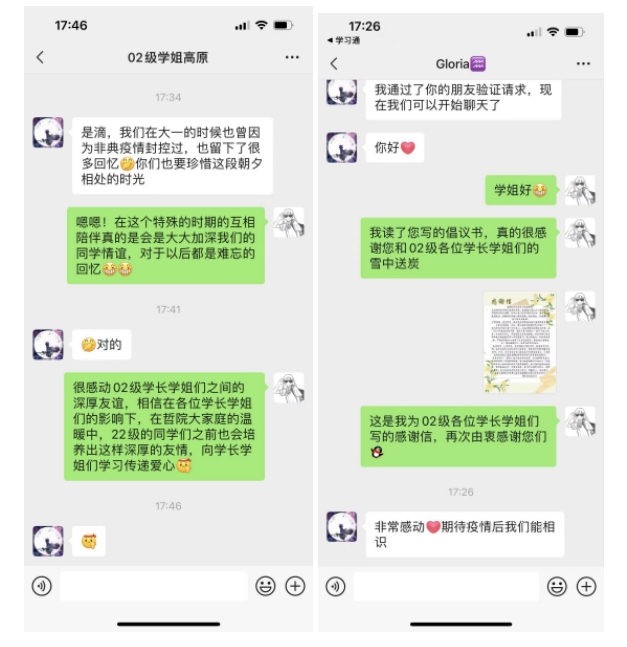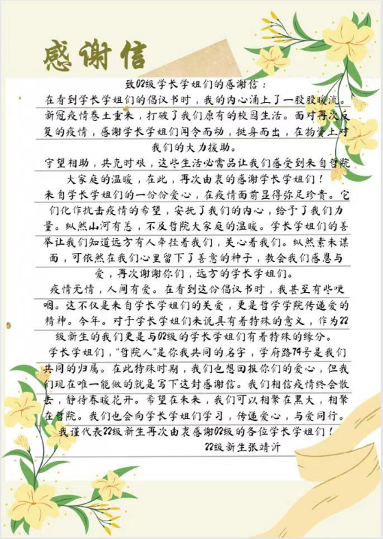 当我院学子获悉2002级校友的捐赠,大家都感动不已,2022级新生张靖沂更是难以抑制内心激动向老学长、老学姐们写了一封感谢信表达拳拳之情。巧合的两届学子入学黑大正好相差20年,时隔20年,两代黑大学子在这种特殊的疫情的环境中建立了校友之间温暖而紧密的感人情谊,也见证了黑大哲学人的薪火相传。
