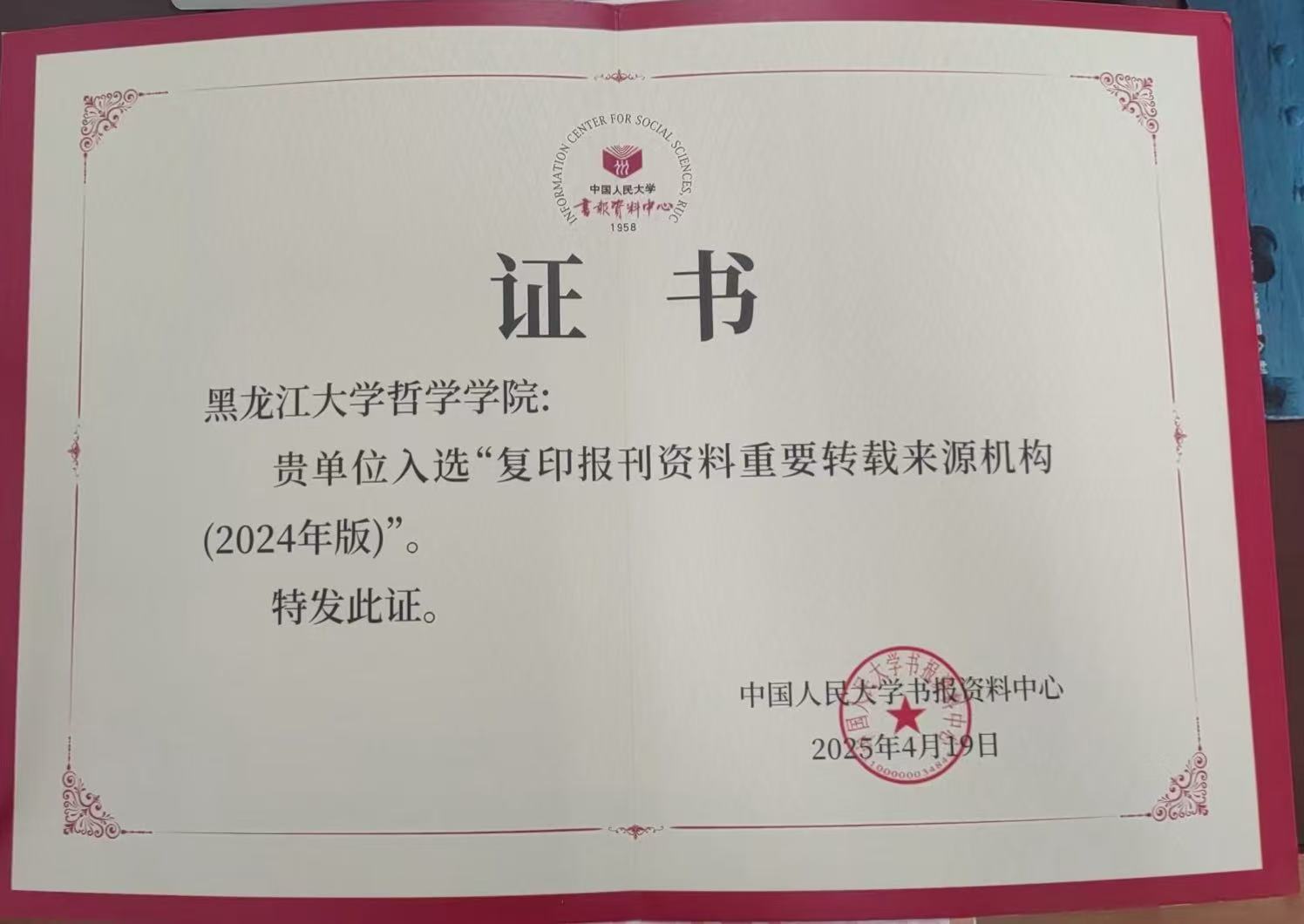 成功入选,获颁认证证书(2025年4月19日)。本次成功入选,既是对我院近年来学科建设领域取得系列成绩的肯定,也是对我院在国内哲学学科建设中的科研影响力的肯定。