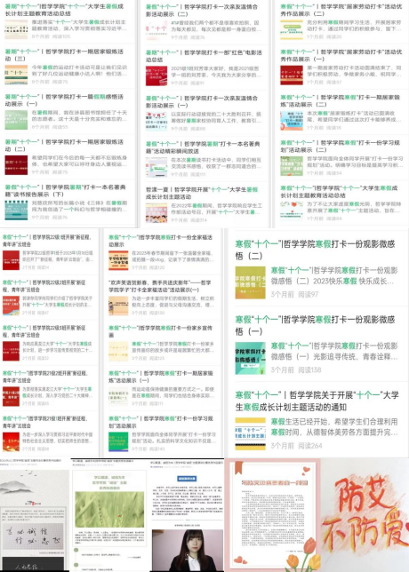 学生多次举行如集中观看、交流会、讲座、党课、校史馆云参观等活动,坚持定期开展党员发展对象、预备党员与入党积极分子、学生干部培训学习会,开设了“哲学学工能力作风建设”等专栏。