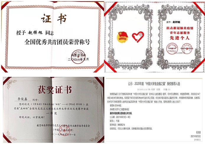 2015级哲学专业学生李俊鑫荣获2019年首届“五四杯”全国马克思主义理论类本科生学术论文竞赛一等奖,2017级哲学专业学生李承乾荣获2019年度黑龙江省“青年大学习”主题团课组织工作“先进个人”,学院团委荣获2019年91大神