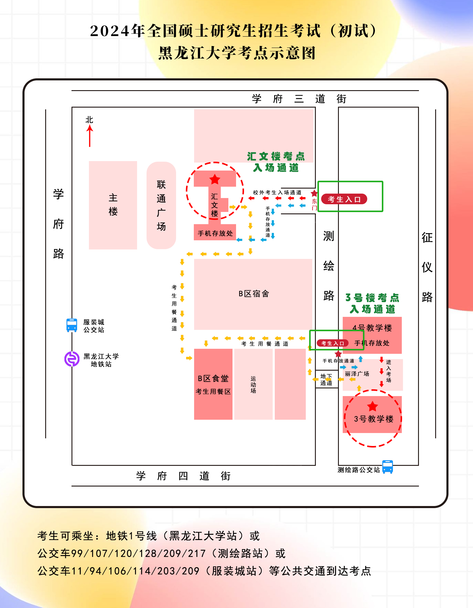 考点在汇文楼考区和三号教学楼考区各设1处手机存放点供考生存放手机,为提高考生入场速度,建议考生来校时不携带手机,准备足量现金及零钱用于出行及用餐。为方便考试统一管理,考生车辆禁止驶入校园,送考车辆即停即走。