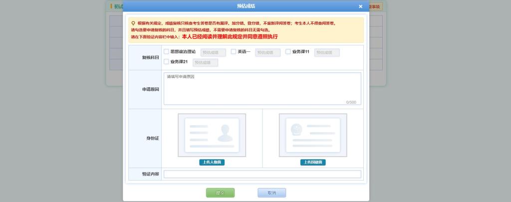 硕士研究生招生服务系统(//yz.91dsvod.org/login_mas.html),填写报名相关信息进行登录,进入“硕士成绩查询”页面,考生在可申请复核的时间段中,若对科目成绩有异议,点击“申请复核”,弹出弹框,在弹窗中,勾选要复核的科目并填写该科目的预估成绩以及申请原因和验证内容,并上传证件照片后,点击“提交”,可申请复核。(注:每名考生只能申请一次复核,所以确认复核前请确认是否勾选所有需复核的科目,并确认身份证信息上传正确,再提交,提交后所有信息均不可再修改,请考生检查上传材料及信息确认无误后提交申请。)